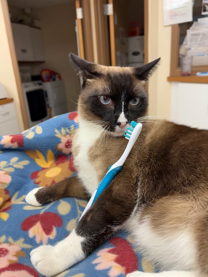 As Roman puts it, “We’re more than cute faces here at the clinic; we care about your pet’s full health.” Miles chimes in with a purr, “Take care of those chompers; they’re part of what keeps us purring.”